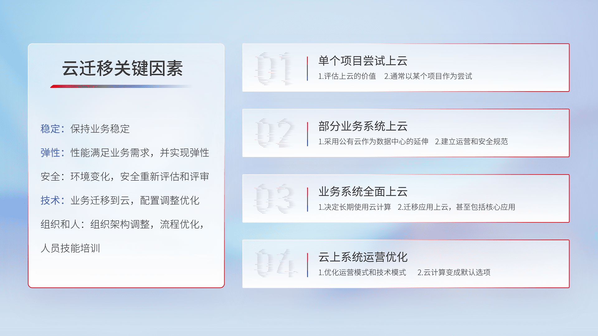 结合实际业务,,,,从规划设计、、、、云平台选型、、、、云原生改造、、、数据迁移、、、、集成交付,,,迁移全过程为客户识别最佳上云路径,,,做好风险识别管理,,,设计网络架构、、、身份权限、、安全审计合规、、操作审计、、日志审计、、、、监控告警策略、、多站点容灾设计等,,,,对云上基础设施进行整体规划,,,提升IT治理水平,,,,以满足弹性、、、、高可用、、高性能的需求。。。