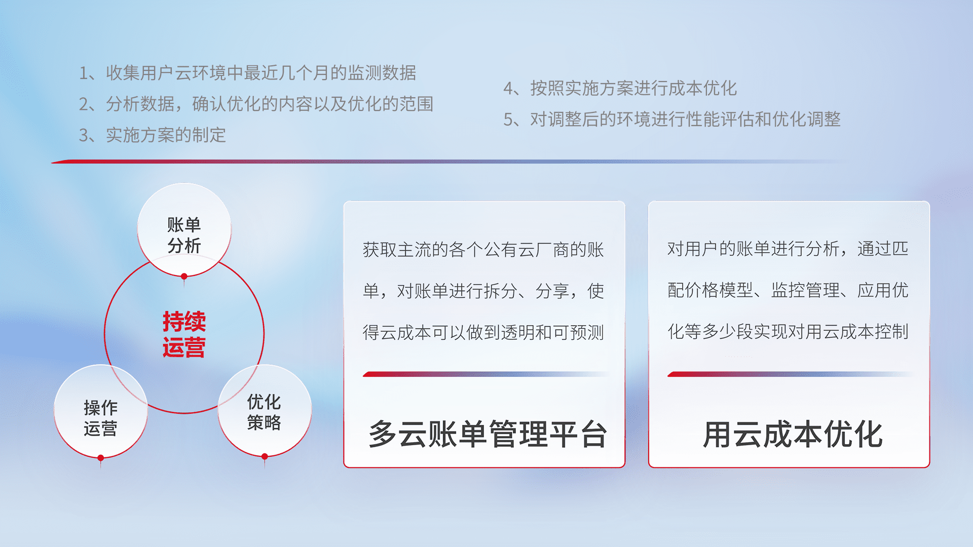 通过多云纳管,,,,以统一的资源数据模型把客户的云资源进行抽象和封装,,进而实现对多云资源的统一操作,,保障云资源管理的可靠性、、、、稳定性与可用性。。。。量身定制化运维内容,,,,配置、、、开发运维、、、补丁管理、、备份、、、监控、、、、认证和访问管理、、、审计和日常巡检等,,,,保障在用云过程中的可靠度,,,,稳定度以及高可用率。。。。